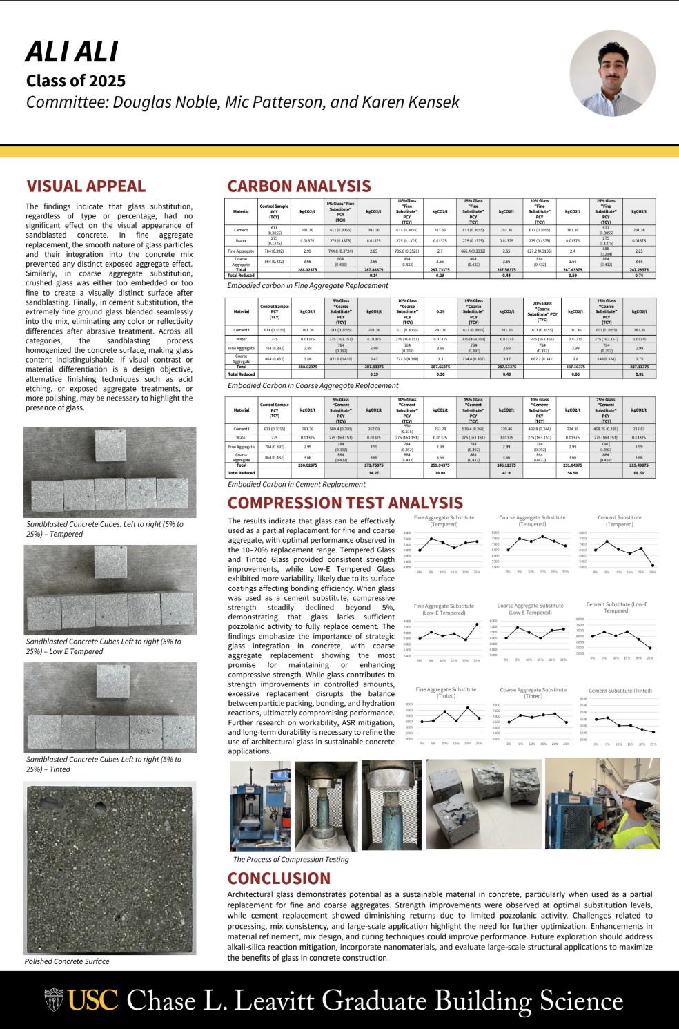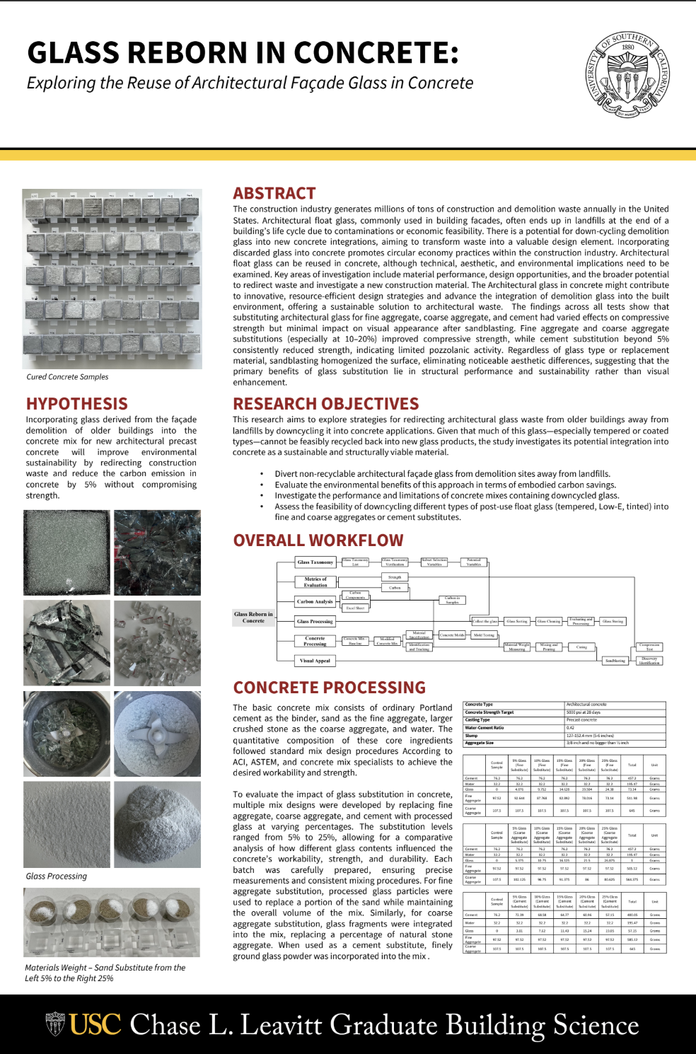 The U.S. construction industry produces vast amounts of demolition waste, including architectural float glass from building facades. Due to recycling limitations, much of this glass ends up in landfills. This research explores down-cycling architectural glass into concrete as fine aggregate, coarse aggregate, and cement substitutes. Results show improved compressive strength at 10–20% aggregate replacement, while cement substitution beyond 5% reduced strength. Sandblasting minimized visual differences across mixes, highlighting structural and sustainability benefits over aesthetic enhancement. The study supports reusing demolition glass to promote circular economy practices and develop resource-efficient, sustainable building materials for the future built environment.