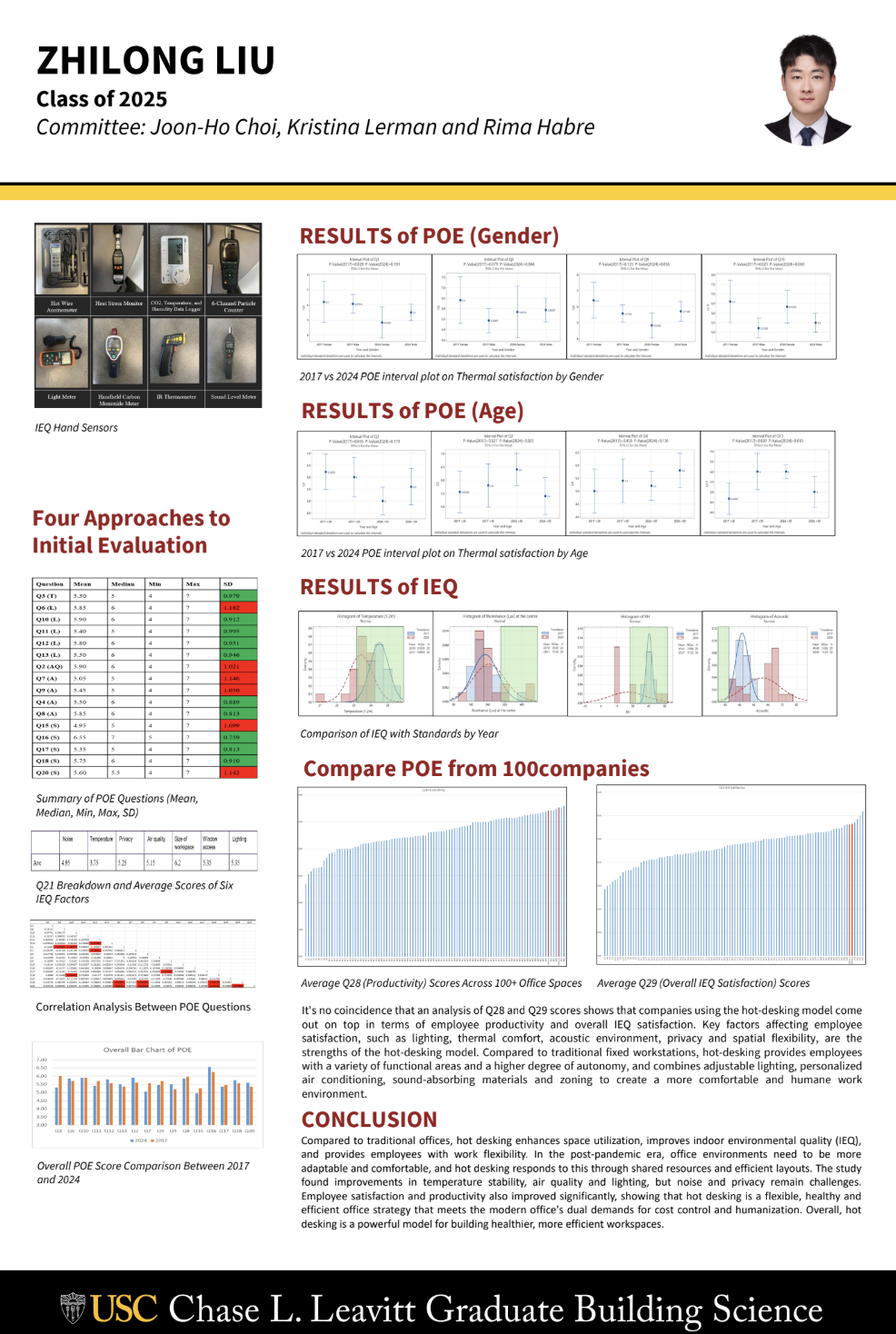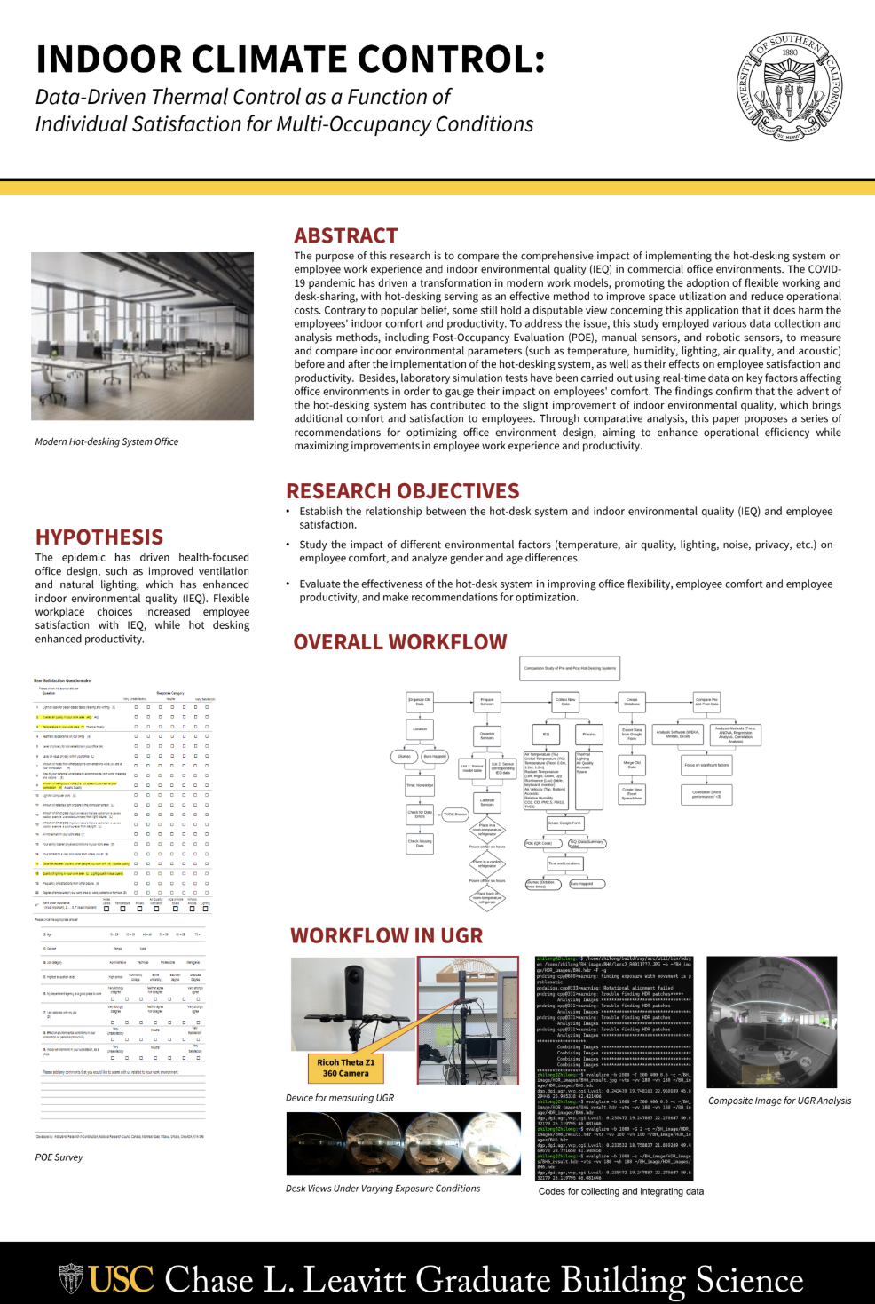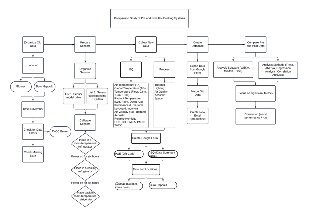 This study investigates the impact of hot-desking on employee experience and IEQ in commercial offices. Using POE surveys, sensor data, and lab simulations, it compares environmental parameters before and after implementation. Results indicate that hot-desking slightly improves comfort and productivity. The study supports hot-desking as a strategy to optimize space use and enhance workplace efficiency.