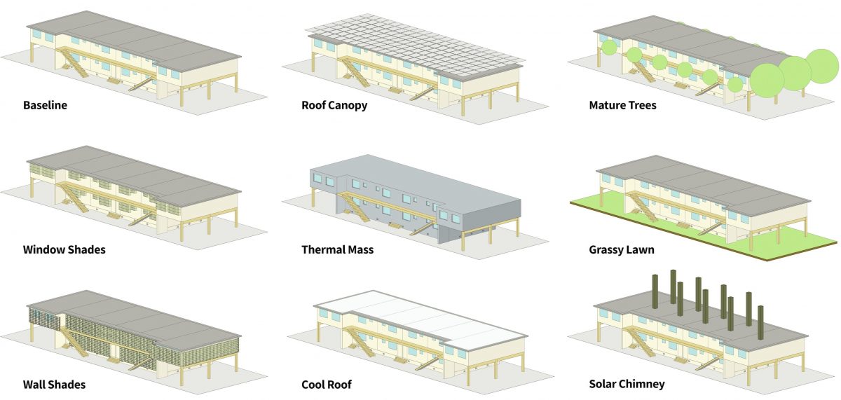 Climate change is increasing the frequency and severity of heat wave events; however, existing apartment buildings in Los Angeles do not typically provide passive cooling, and instead exacerbate an individual’s exposure to extreme heat. In this study, a typical Dingbat apartment building was digitally modeled, and indoor air temperatures were measured in a heat wave simulation. A matrix of passive cooling remedies was then applied to the apartment building, and the reduced indoor air temperatures were measured against the baseline apartment building. The simulation results found that the combined use of phase change materials, ventilation, insulation, and shade, can reduce indoor temperatures significantly enough to consider retrofit strategies in place of mechanical cooling solutions for older apartment buildings in Los Angeles.