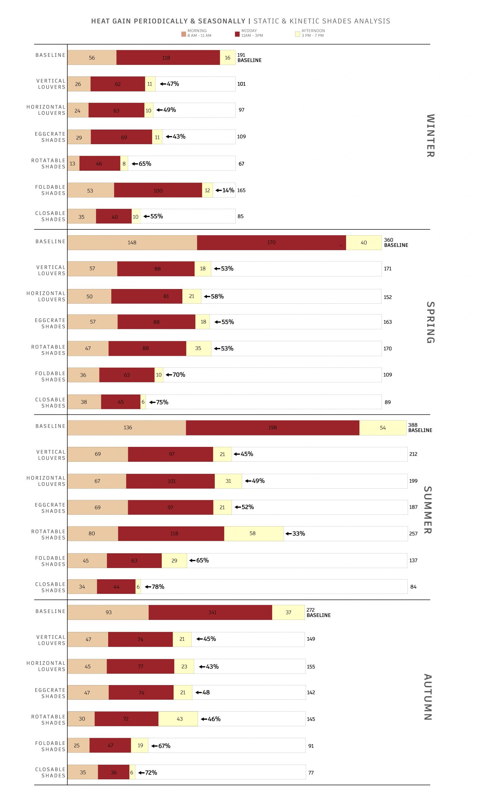 Kinetic systems consistently outperformed static ones, except for the vertical louvers. With foldable shades reducing heat gain through apertures by over 54% while preserving daylight. Closable shades showed the greatest reduction—up to 74% at midday—but risked increasing heating loads in cooler periods and artificial lighting needs. Rotatable shades offered better daylight access but were less effective at limiting peak heat.