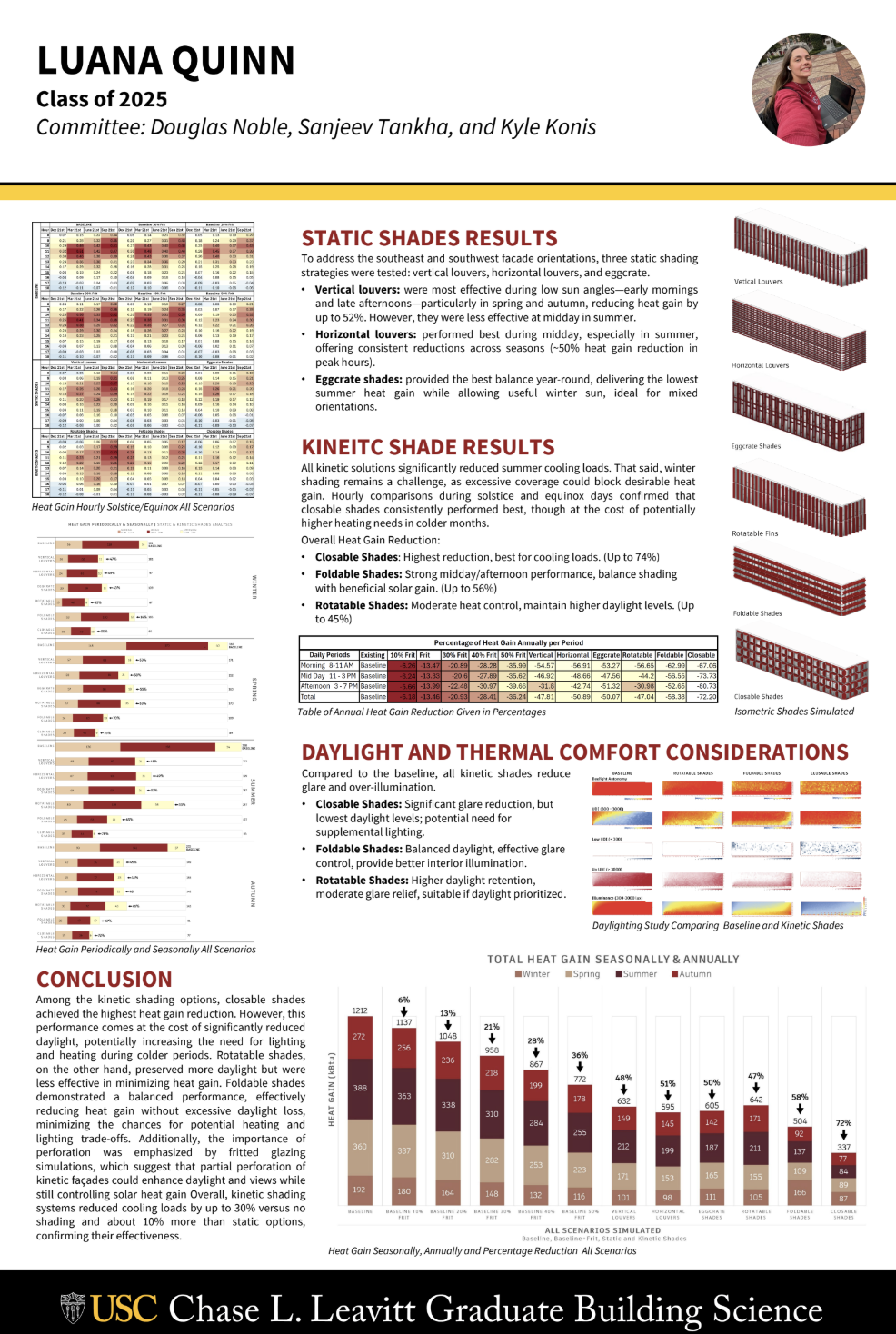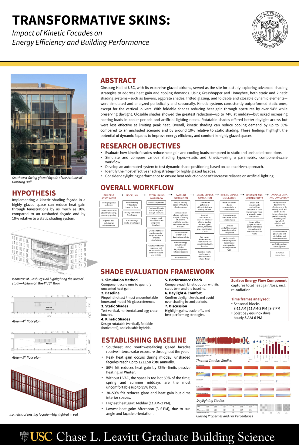Ginsburg Hall at USC, with its expansive glazed atriums, served as the site for a study exploring advanced shading strategies to address heat gain and cooling demands. Using Grasshopper and Honeybee, both static and kinetic shading systems—such as louvers, eggcrate shades, fritted glazing, and foldable and closable dynamic elements—were simulated and analyzed periodically and seasonally.