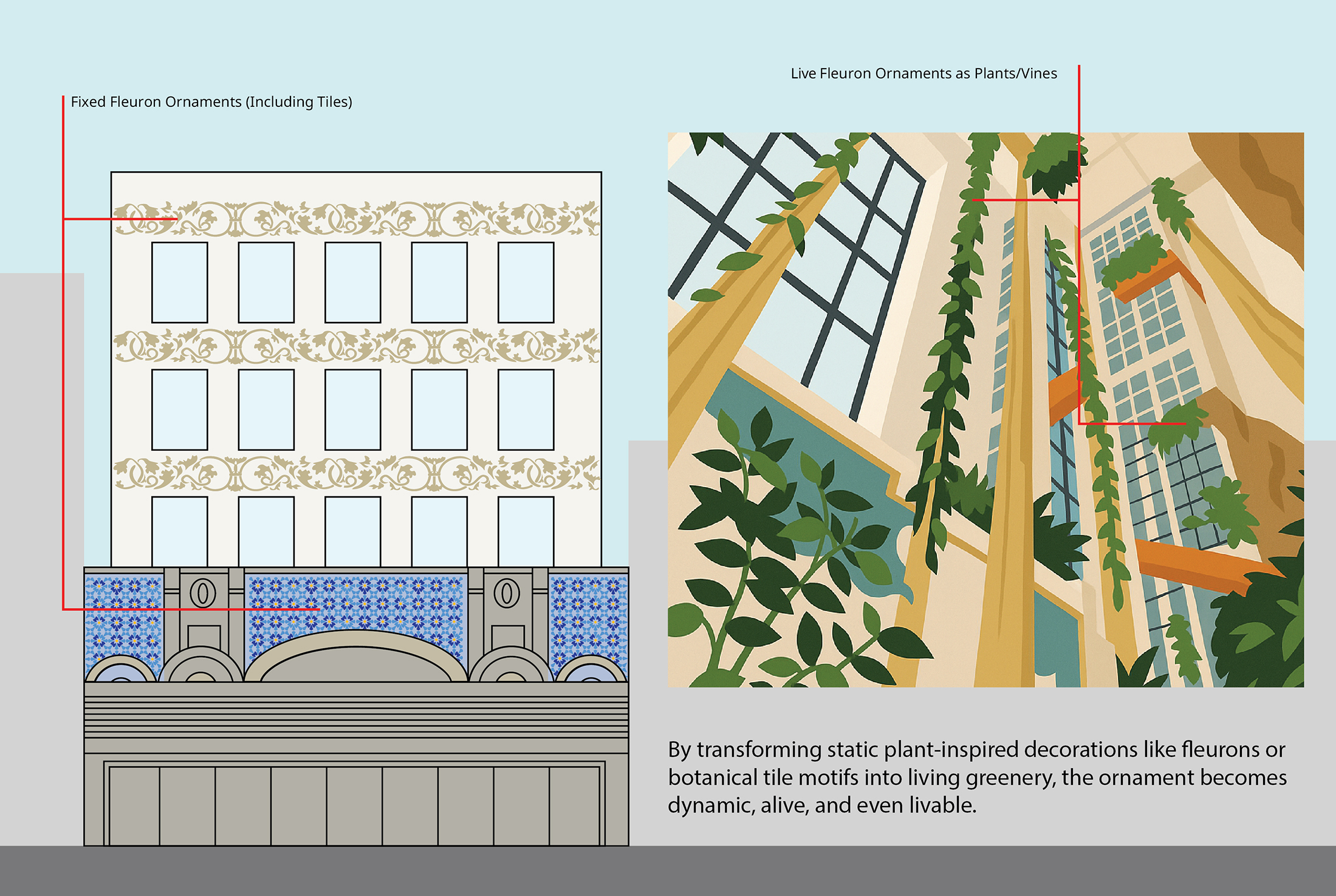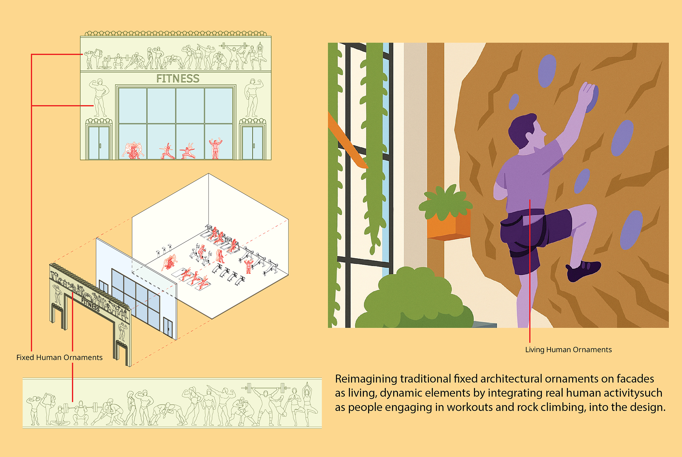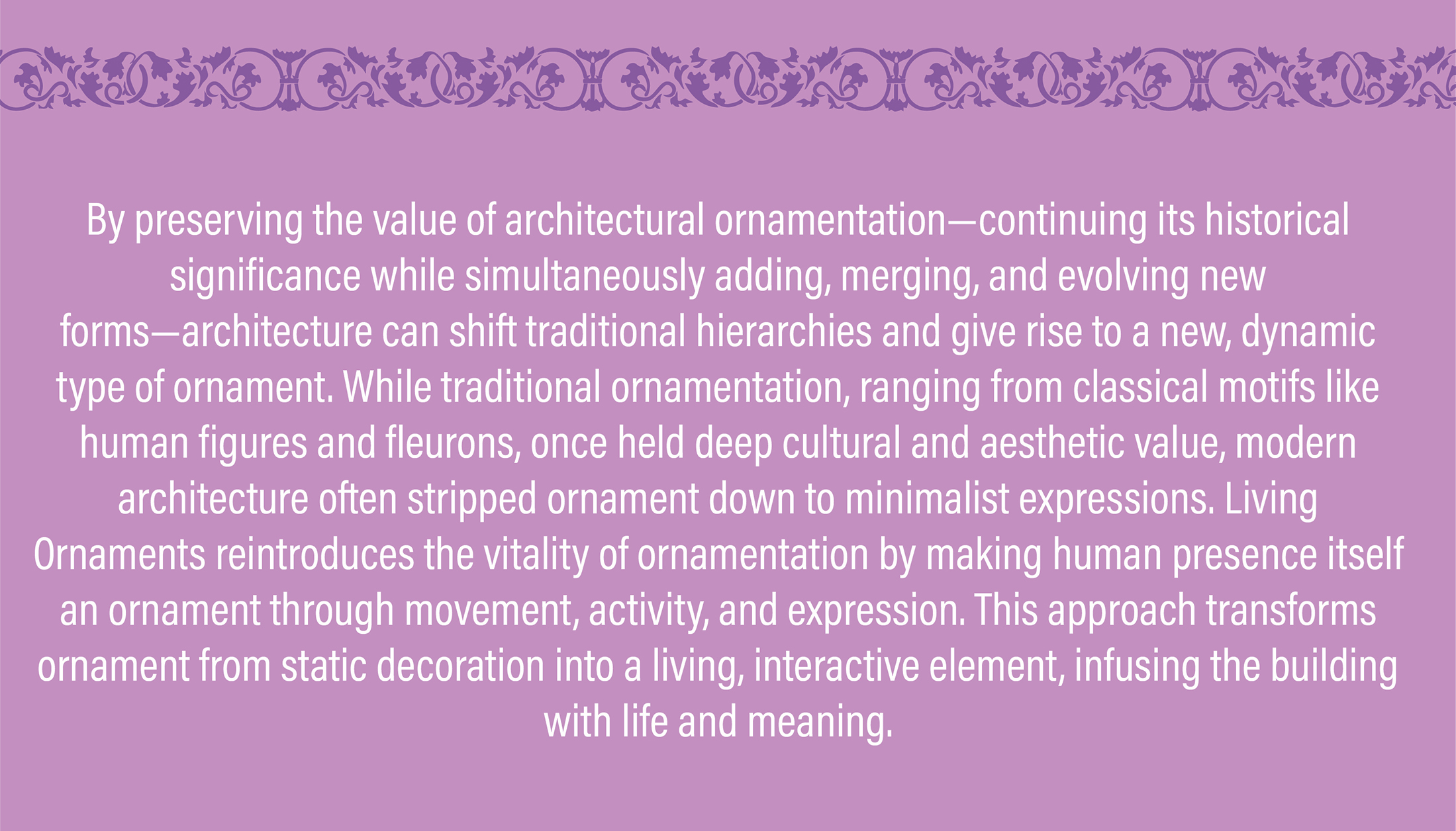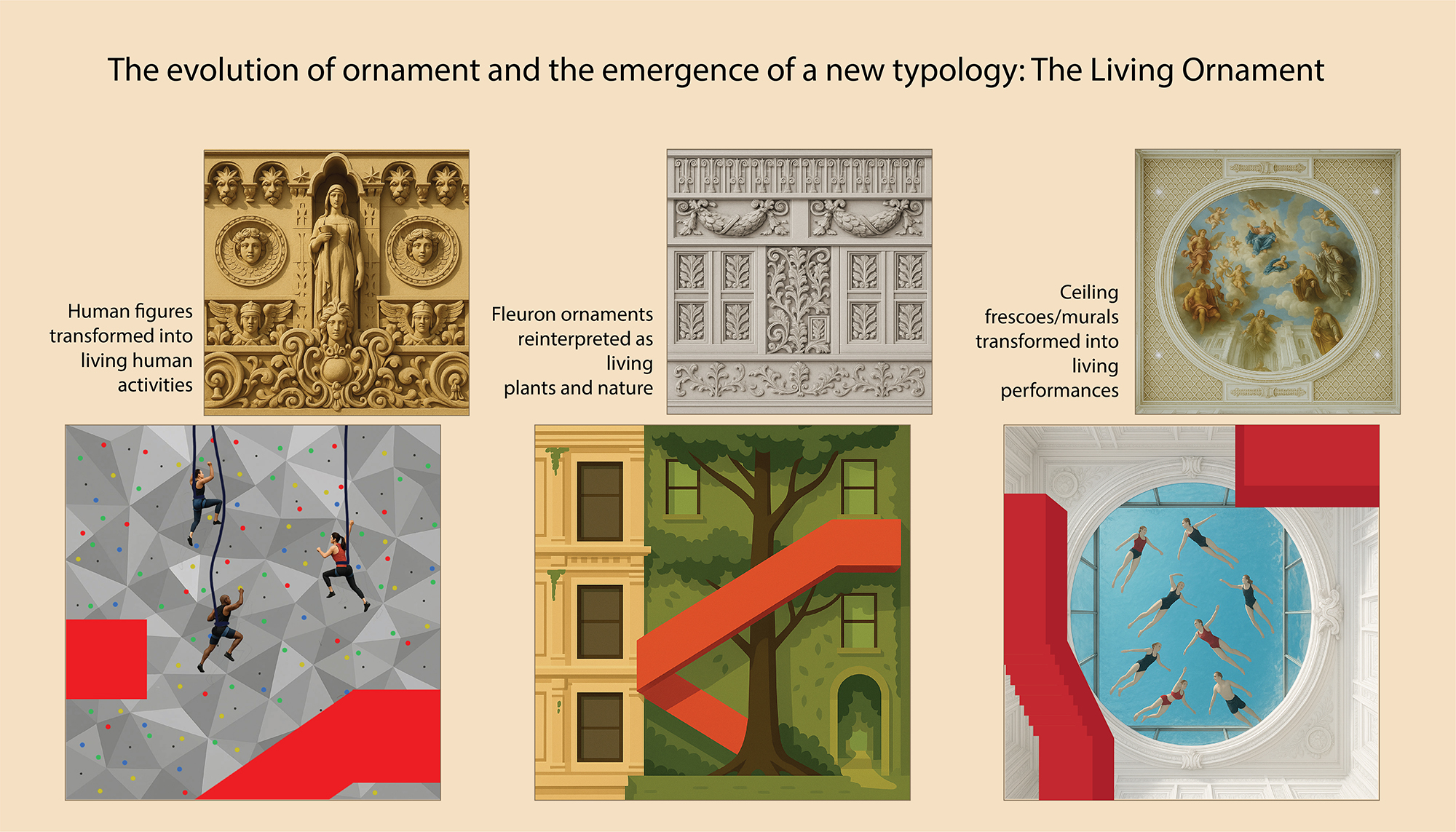 By preserving the value of architectural ornamentation—continuing its historical significance while simultaneously adding, merging, and evolving new forms—architecture can shift traditional hierarchies and give rise to a new, dynamic type of ornament. While traditional ornamentation, ranging from classical motifs like human figures and fleurons, once held deep cultural and aesthetic value, modern architecture often stripped ornament down to minimalist expressions. Living Ornaments reintroduces the vitality of ornamentation by making human presence itself an ornament through movement, activity, and expression. This approach transforms ornament from static decoration into a living, interactive element, infusing the building with life and meaning.