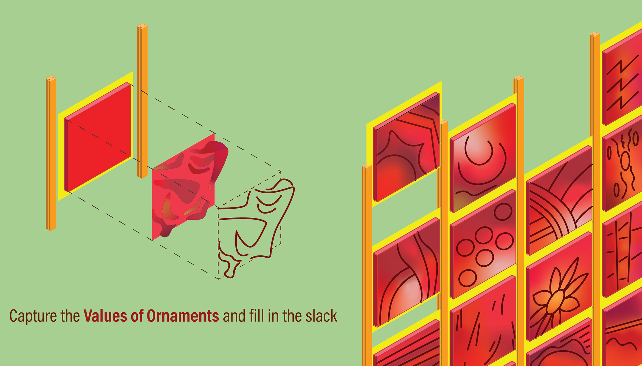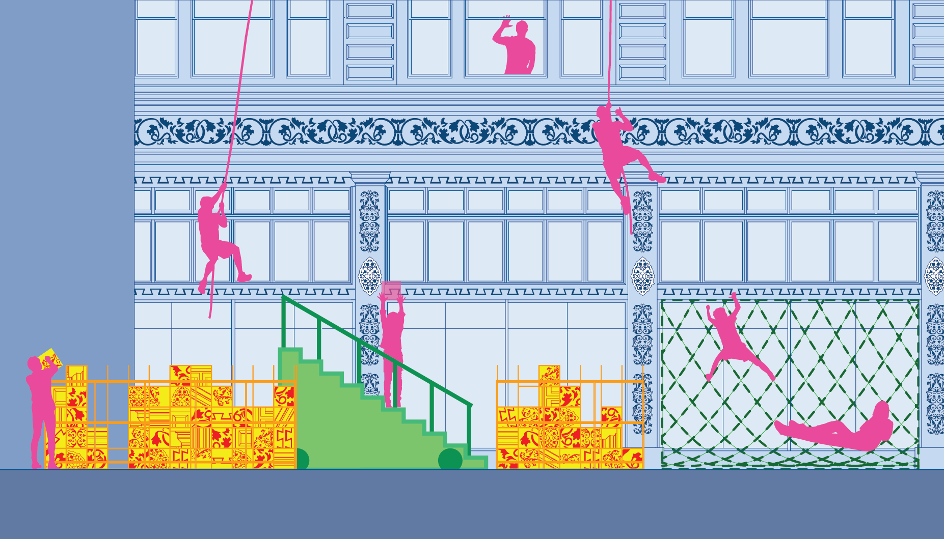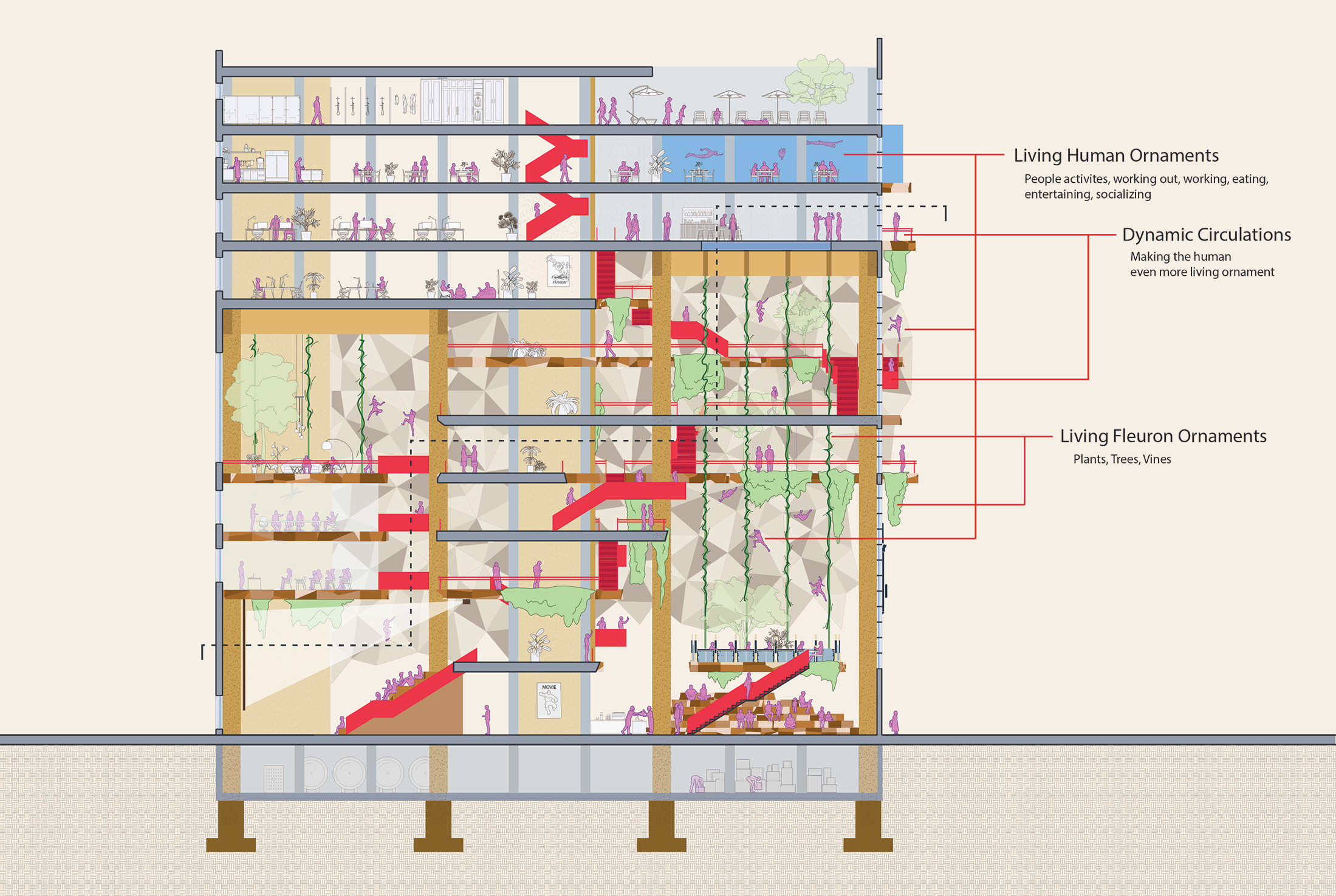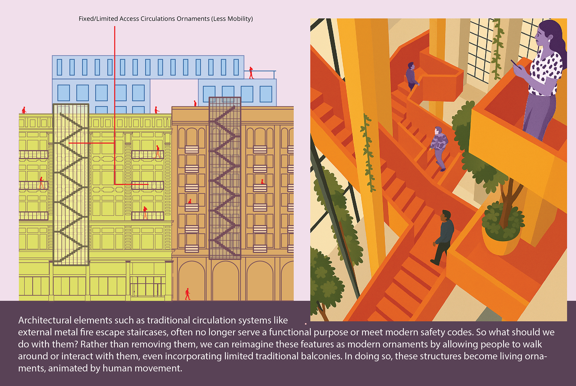 By preserving the value of architectural ornamentation—continuing its historical significance while simultaneously adding, merging, and evolving new forms—architecture can shift traditional hierarchies and give rise to a new, dynamic type of ornament. While traditional ornamentation, ranging from classical motifs like human figures and fleurons, once held deep cultural and aesthetic value, modern architecture often stripped ornament down to minimalist expressions. Living Ornaments reintroduces the vitality of ornamentation by making human presence itself an ornament through movement, activity, and expression. This approach transforms ornament from static decoration into a living, interactive element, infusing the building with life and meaning.
