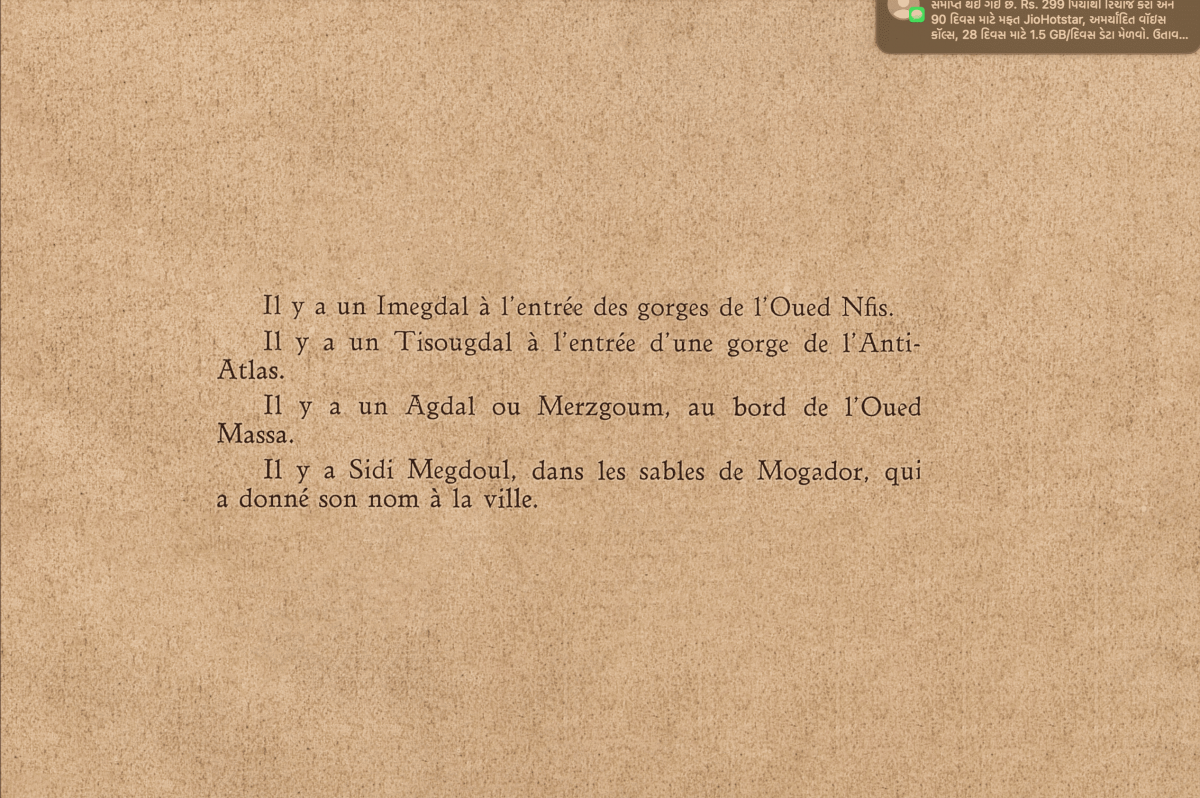 Justinard, L. (May 1936). Les propos du Chleuhs: Aguedal, sagesse, et poésie [Words of the Chleuhs: Aguedal, wisdom, and poetry]. Revue de l’Aguedal, 1.