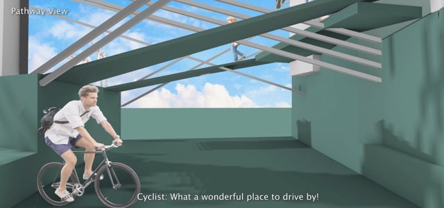The design is a fragmented performance space with an audience separated by a bike path, but tied together with bridges. These bridges are literally transitional interaction points between audience and performer. The performance here is an interactive dance performance.The steel structures running across the site reflect the interaction taking place between the performers and the audience. The steel structures not only integrate the architecture throughout the site but also act as handrails establishing a consistent language throughout the site.