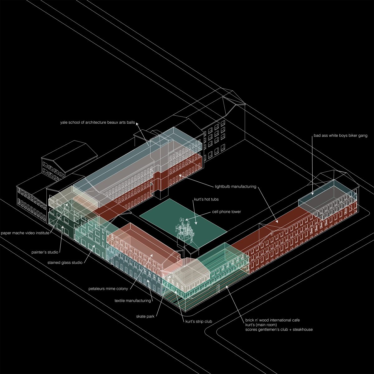 This project reinterprets the abandoned New Haven Clock Company building by translating digital tropes, such as glitches, deep fry, photogrammetry, and collage, into architectural form. Informed by the building’s layered history as both an industrial site and a haven of subculture, this proposal uses these digital distortions to expose, warp, and recompose material traces of the past. Rather than restoring the factory or preserving the ruin, this project embraces historically specific methods of transformation, creating spatial opportunities for the next generation of subculture communities. The result is a hybridized architecture that resists erasure, highlights discontinuity, and defies architectural norms.