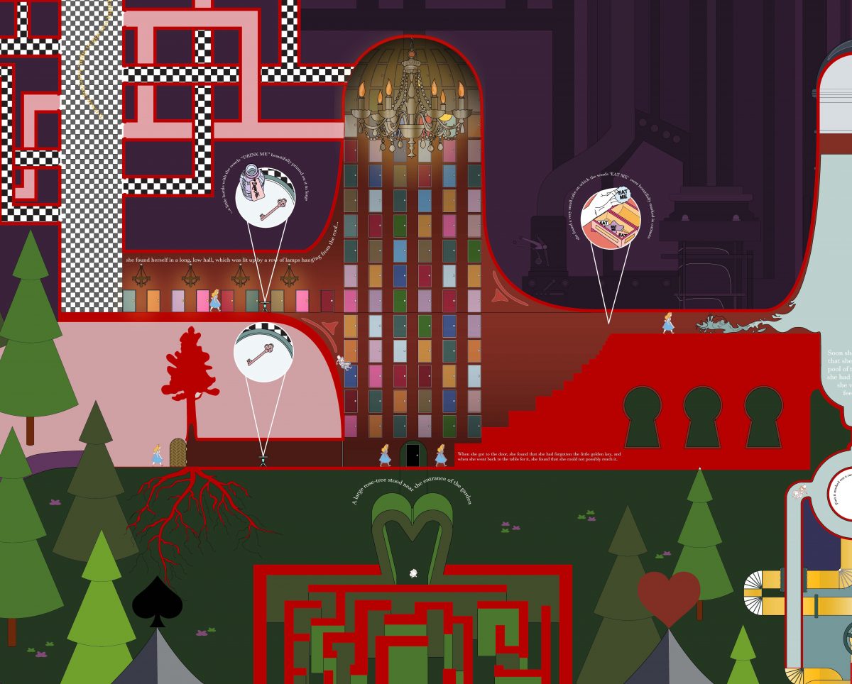 This thesis project explores how standard orthographic drawings, much like literature, communicate stories through visual and pictorial clues. By examining parallels between architectural representation and narrative techniques in literature, film, video games, and comics, the project challenges the notion that architecture is limited in its expressive capacity, demonstrating that drawings themselves can act as narrative devices that engage both practical and emotional storytelling. Using the story of Alice in Wonderland as a narrative framework, the project investigates architectural representation techniques through a series of vignettes, each exploring different levels of control over information given to the audience. These moments reveal how drawings can shape perception, obscure or reveal meaning, and guide interpretation—treating architectural representation not just as a technical tool, but as a visual language of narrative construction.