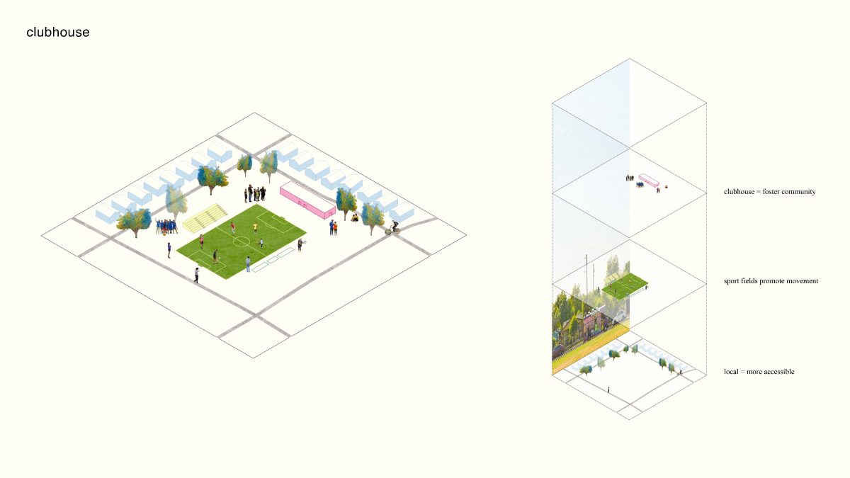 This project explores the transformation of underutilized school fields in Los Angeles County, with a focus on Downey, into sites for neighborhood sports clubhouses. Yoli drew inspiration from her 2024 USC Jon Adams Jerde Traveling Fellowship, during which she studied the urban planning and programmatic elements of successful European clubhouses.