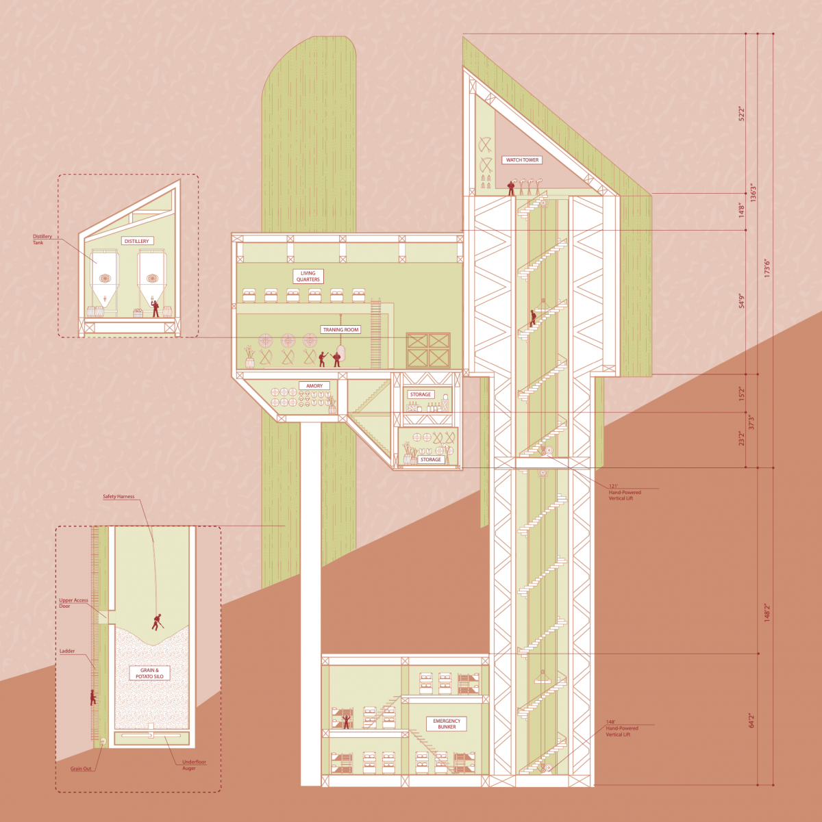 “The Children of the Earth and Sun” is a speculative, regenerative farming community that critiques contemporary sustainability efforts through the lens of ritual and devotion. Set in fire-scarred Paradise, CA, the project reinforces bureaucratic sustainability goals within a hyper disciplined system rooted in closed-loop cycles of food, energy, and governance. Architecture becomes shelter, ceremony, infrastructure, and instrument. Each building, a “child”, maintains a sacred stewardship – harvest, worship, lumber, power, water, cooking, and security – offering a serious and sincere blueprint for a self-sufficient future.
