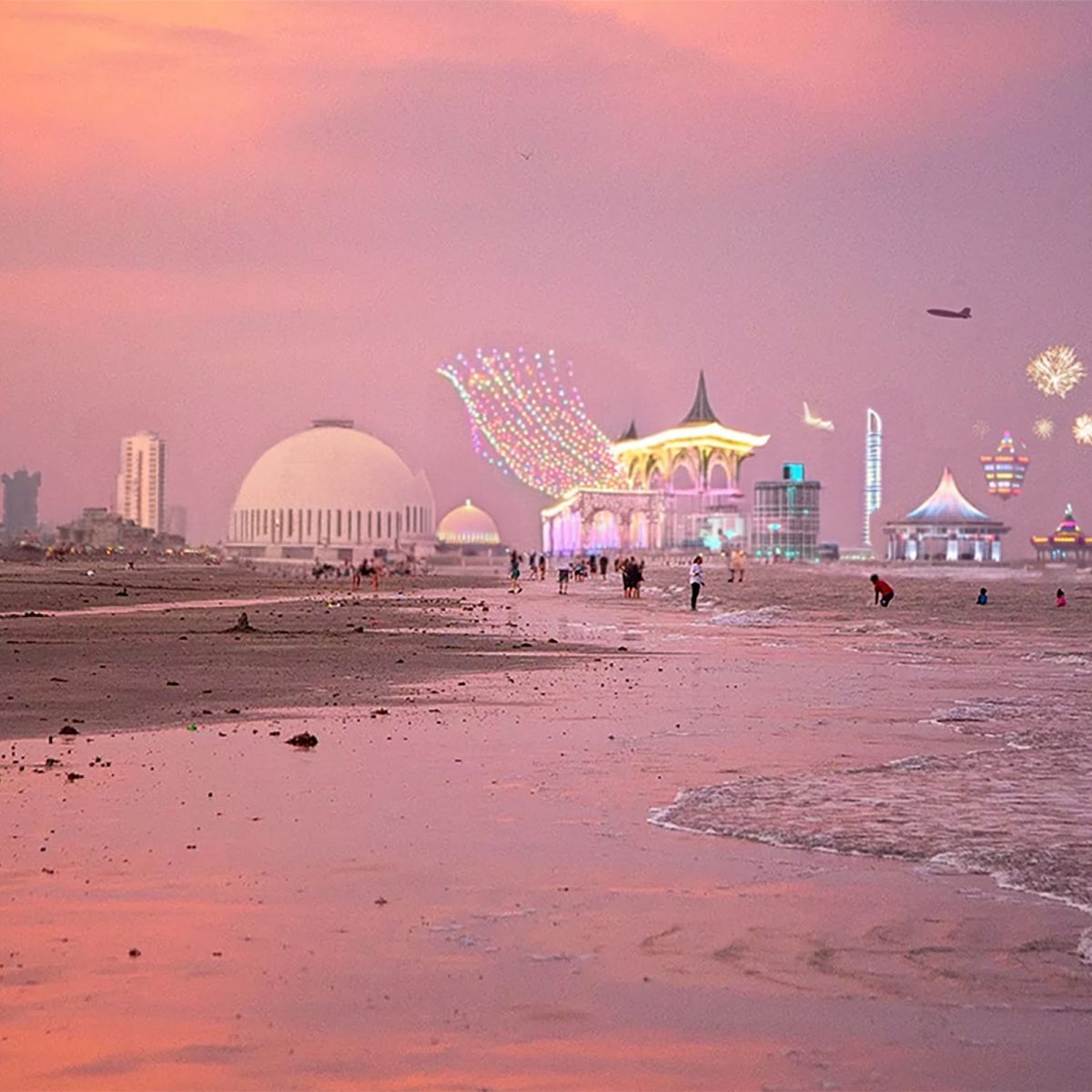 A century in the future, the burgeoning spectacle of global society’s implosion culminates in a symptomatic death bloom: a celebration of life too late in the form of the 2125 World Expo. Located in the port-city made paradise of Corpus Christi, Texas, this expo reprises the Grand Ring of its century-old, Osakan predecessor. A massive boardwalk of a city in a world going down singing, filled with constructs of virtues turned vices. As time marches on, the manicured grandness of this design will be overcome by auto constructed dwellings, and generations later, shall erode away. Once outgrown, this finite landscape will be used as raw material to craft the instruments of its populace’s withdrawal, and they shall act as agents of their own undoing.